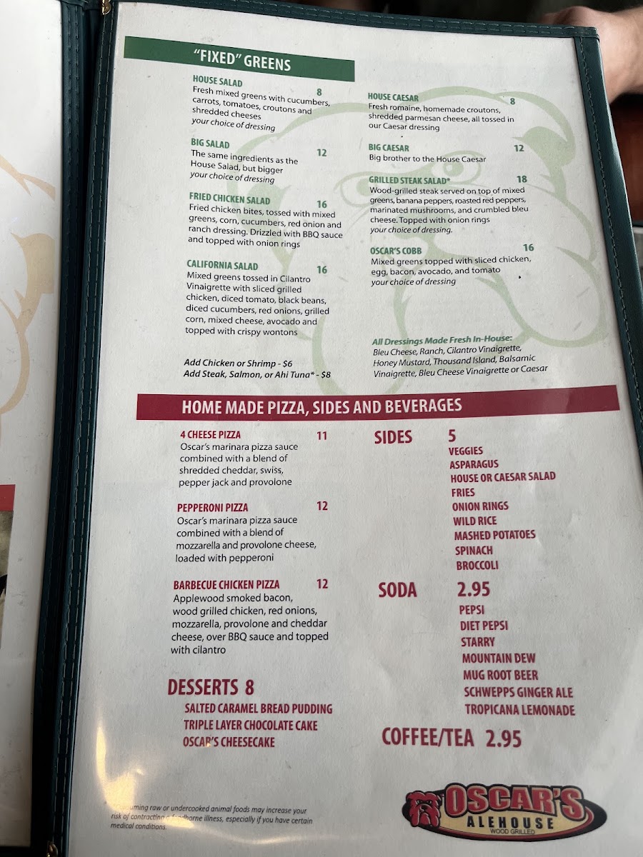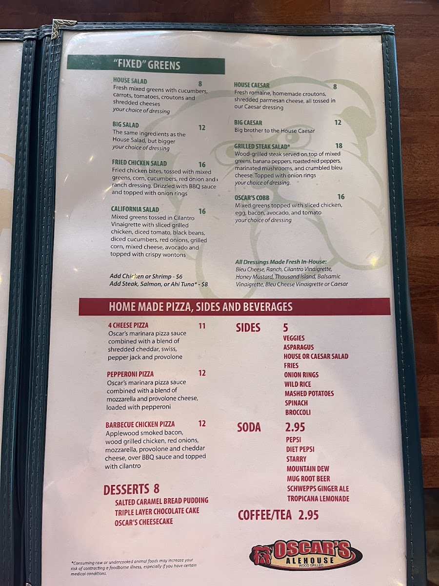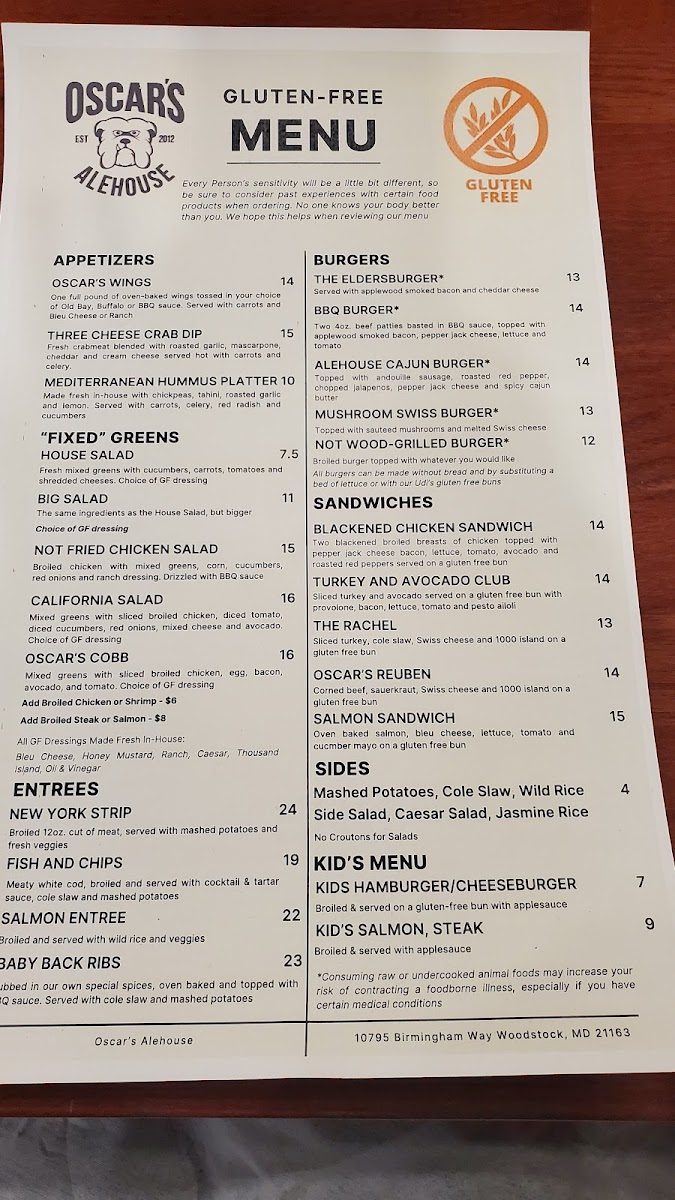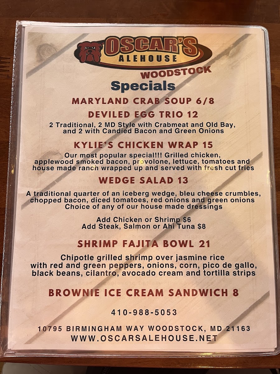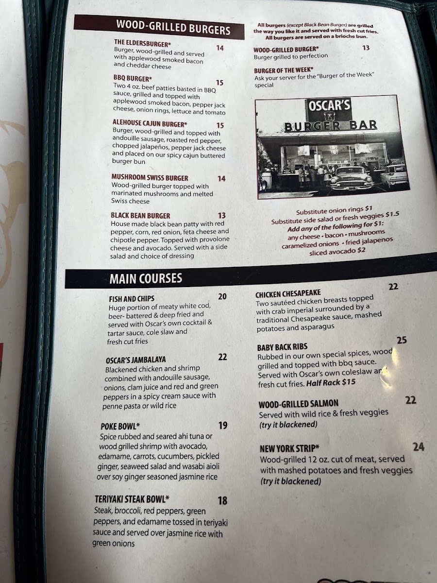 As a diner reflecting on the menu at Oscar's Alehouse, I find it impressively well-rounded, offering comfort, variety, and a touch of creativity that suits everything from casual lunches to relaxed dinners at the Woodstock location. The soup selection sets a strong opening with hearty options like Bowl Cream Of Crab, Bowl Oscar’s Chili, and the classic Bowl French Onion, alongside lighter portions such as Cup French Onion and Cup Cream Of Crab, making it easy to tailor your start. Sandwich lovers are well taken care of with satisfying picks like Oscar’s Cheese Steak Sandwich, Oscar’s Grouper Sandwich, Cuban Sandwich, Turkey And Avocado Club, and Shrimp & Bacon Club, all designed to be filling without being overcomplicated. The main courses elevate the menu with crowd-pleasers such as New York Strip, Teriyaki Steak Bowl, Fish And Chips, Oscar’s Jambalaya, and Chicken Chesapeake, showcasing a balance between classic American fare and bolder flavors. For guests who enjoy discovering something different, the Secret Menu items-Kylie's Chicken Wrap and Ahi Tuna Wrap-add an element of fun and exclusivity. Health-conscious diners aren’t left out either, thanks to salads like California Salad, Fried Chicken Salad, Side Caesar Salad, Grilled Steak Salad, and House Caesar, which provide fresh and flavorful alternatives. Pizza fans can rely on staples such as Pepperoni Pizza, Barbecue Chicken Pizza, and 4 Cheese Pizza, while appetizers including App Chicken Quesadilla, Hummus Platter, Three Cheese Crab Dip, Oscar’s Wings, and Chips & Guac are perfect for sharing. Families will appreciate the thoughtful kids’ menu with Kid Chx Tenders, Kid Pizza, Kid Grilled Cheese, Kid Salmon, and Kid Hamburger. To finish on a sweet note, desserts like Chocolate Cake and Oscar’s Cheesecake deliver classic indulgence. With satisfying sides such as Side Dip Bread, Onion Rings, Fries, Side Hummus Veggies, and Side Coleslaw, plus a strong burger lineup including The Eldersburger, BBQ Burger, Alehouse Cajun Burger, Wood Grilled Burger, and Black Bean Burger, Oscar’s Alehouse ultimately presents a menu that feels inclusive, comforting, and consistently appealing.