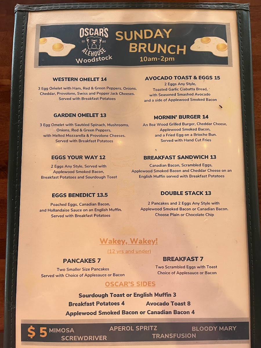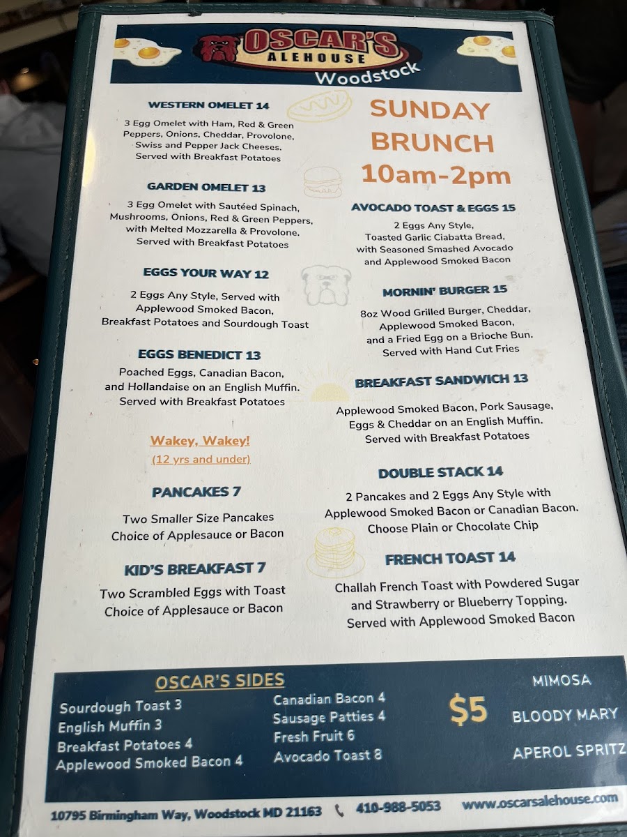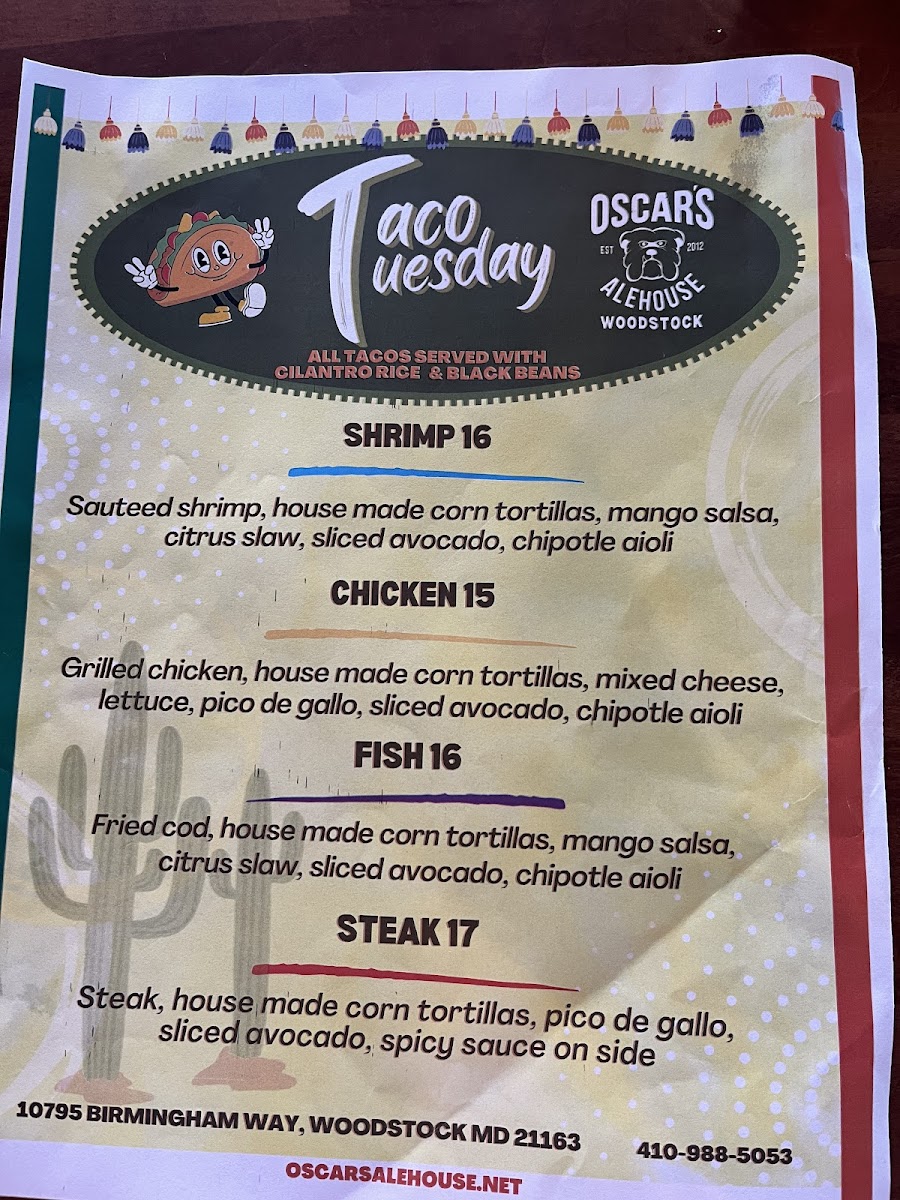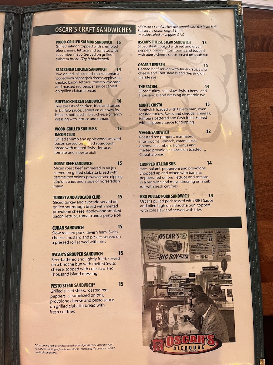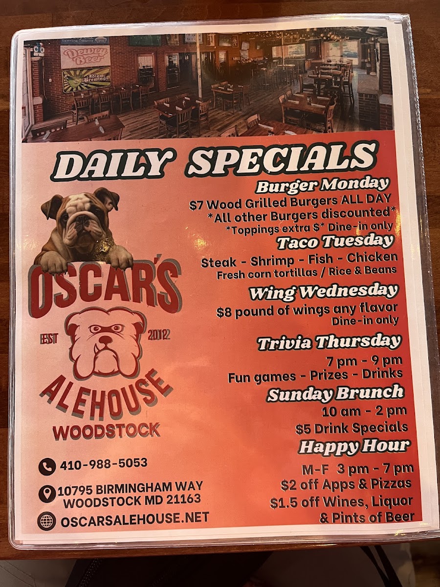 As a diner reflecting on the menu at Oscar's Alehouse, I find it impressively well-rounded, offering comfort, variety, and a touch of creativity that suits everything from casual lunches to relaxed dinners at the Woodstock location. The soup selection sets a strong opening with hearty options like Bowl Cream Of Crab, Bowl Oscar’s Chili, and the classic Bowl French Onion, alongside lighter portions such as Cup French Onion and Cup Cream Of Crab, making it easy to tailor your start. Sandwich lovers are well taken care of with satisfying picks like Oscar’s Cheese Steak Sandwich, Oscar’s Grouper Sandwich, Cuban Sandwich, Turkey And Avocado Club, and Shrimp & Bacon Club, all designed to be filling without being overcomplicated. The main courses elevate the menu with crowd-pleasers such as New York Strip, Teriyaki Steak Bowl, Fish And Chips, Oscar’s Jambalaya, and Chicken Chesapeake, showcasing a balance between classic American fare and bolder flavors. For guests who enjoy discovering something different, the Secret Menu items-Kylie's Chicken Wrap and Ahi Tuna Wrap-add an element of fun and exclusivity. Health-conscious diners aren’t left out either, thanks to salads like California Salad, Fried Chicken Salad, Side Caesar Salad, Grilled Steak Salad, and House Caesar, which provide fresh and flavorful alternatives. Pizza fans can rely on staples such as Pepperoni Pizza, Barbecue Chicken Pizza, and 4 Cheese Pizza, while appetizers including App Chicken Quesadilla, Hummus Platter, Three Cheese Crab Dip, Oscar’s Wings, and Chips & Guac are perfect for sharing. Families will appreciate the thoughtful kids’ menu with Kid Chx Tenders, Kid Pizza, Kid Grilled Cheese, Kid Salmon, and Kid Hamburger. To finish on a sweet note, desserts like Chocolate Cake and Oscar’s Cheesecake deliver classic indulgence. With satisfying sides such as Side Dip Bread, Onion Rings, Fries, Side Hummus Veggies, and Side Coleslaw, plus a strong burger lineup including The Eldersburger, BBQ Burger, Alehouse Cajun Burger, Wood Grilled Burger, and Black Bean Burger, Oscar’s Alehouse ultimately presents a menu that feels inclusive, comforting, and consistently appealing.